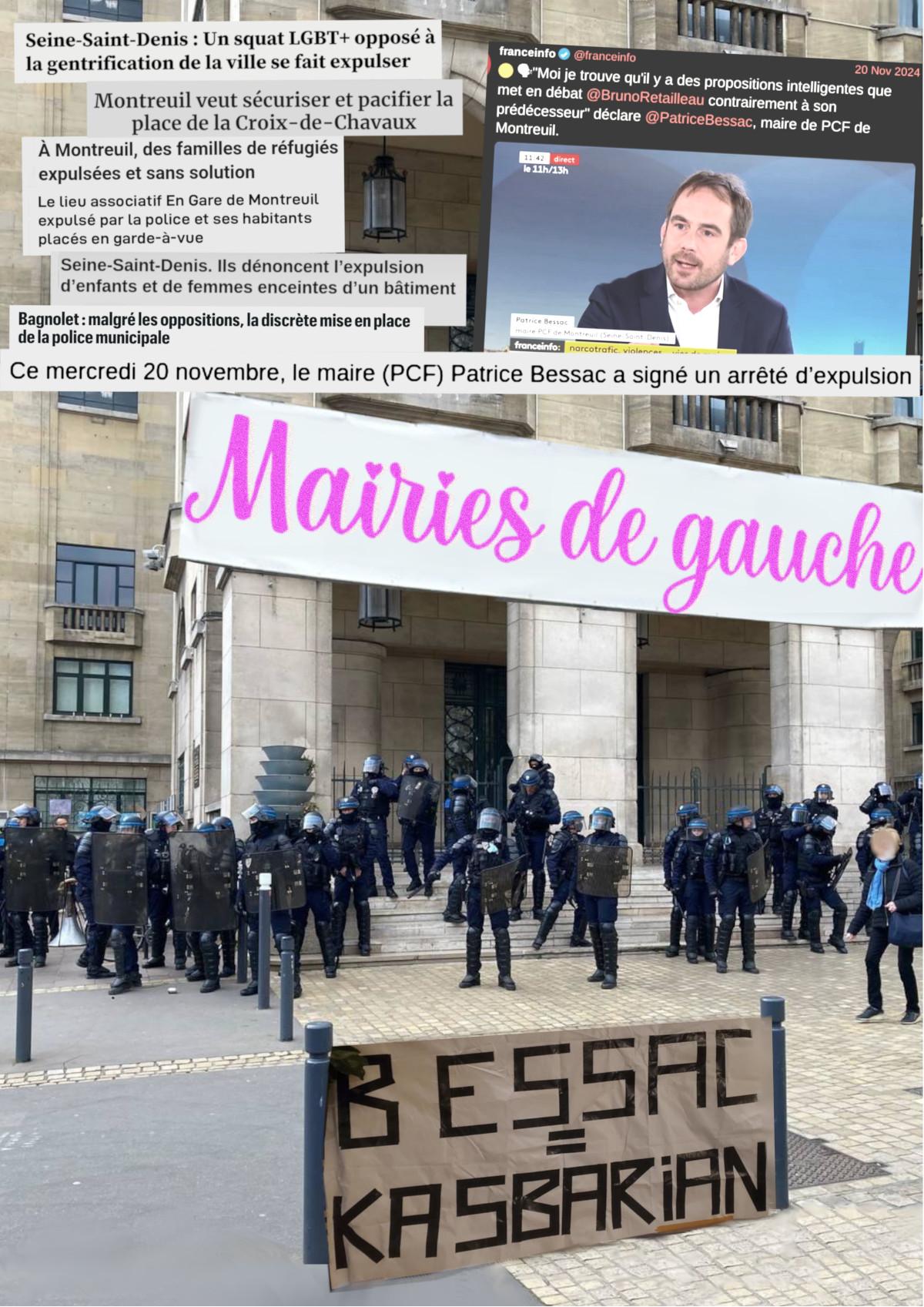 En alimentant la gentrification et la gestion coloniale des quartiers, en expulsant à tour de bras à la Gaîté-Lyrique comme à Montreuil, en participant à la répression de toutes les débrouilles, des refus du travail, des solidarités et des luttes, nos mairies de gauche sont actrices de la fascisation. Elles doivent donc être combattues en tant que telles. Elles aussi traitent la valeur de certain·es vies comme pesant moins que celle des autres. L’horizon qu’elles co-construisent avec le gouvernement et l’Extrême-Droite est toujours plus inégalitaire, capitaliste et raciste, et nous mène vers une exploitation et une atomisation toujours plus violentes. Face à tout ça, la solidarité populaire est notre meilleure arme. Organisons-nous partout contre le mal-logement, le racisme d’État, l’enfermement et les expulsions !